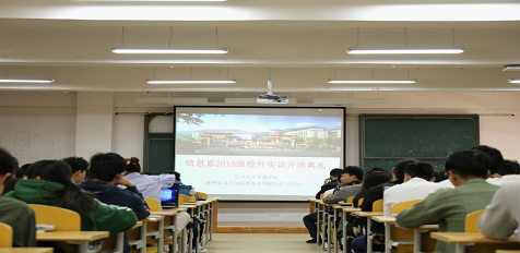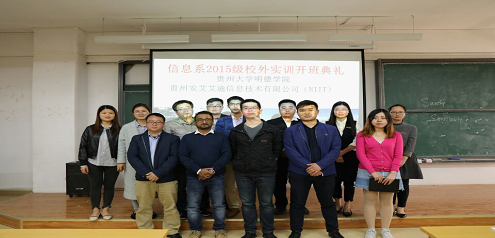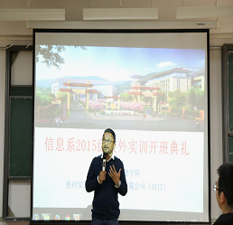 2018年4月18日下午13点30分,我系在B栋311教室,举行了信息系15级的校外实训开班典礼。系主任及系党总支负责人江奇峰、王朋虎老师,现代教育中心主任马良玉老师,NIIT(中国)贵安新区校长黎万祥、NIIT(中国)贵州首席技术官Sandy出席本次典礼,系专业课老师及部分辅导员班主任、NIIT公司(中国)贵安新区培训班老师和15级全体同学参加了本次开班典礼。