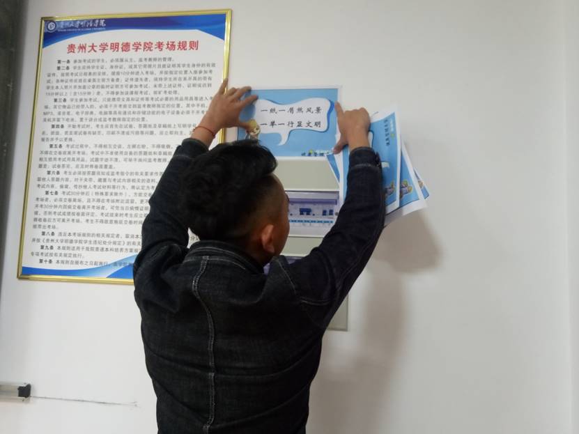 本次活动分小组进行,学生会各个部门为一个小组自己收集标语并制作,然后分别在生物楼每层的教室、走廊、楼梯道、厕所进行美化粘贴。粘贴过程有条不紊,其中粘贴的各类标语用独到丰富的语言,简洁明了的表达了爱护校园的意义。