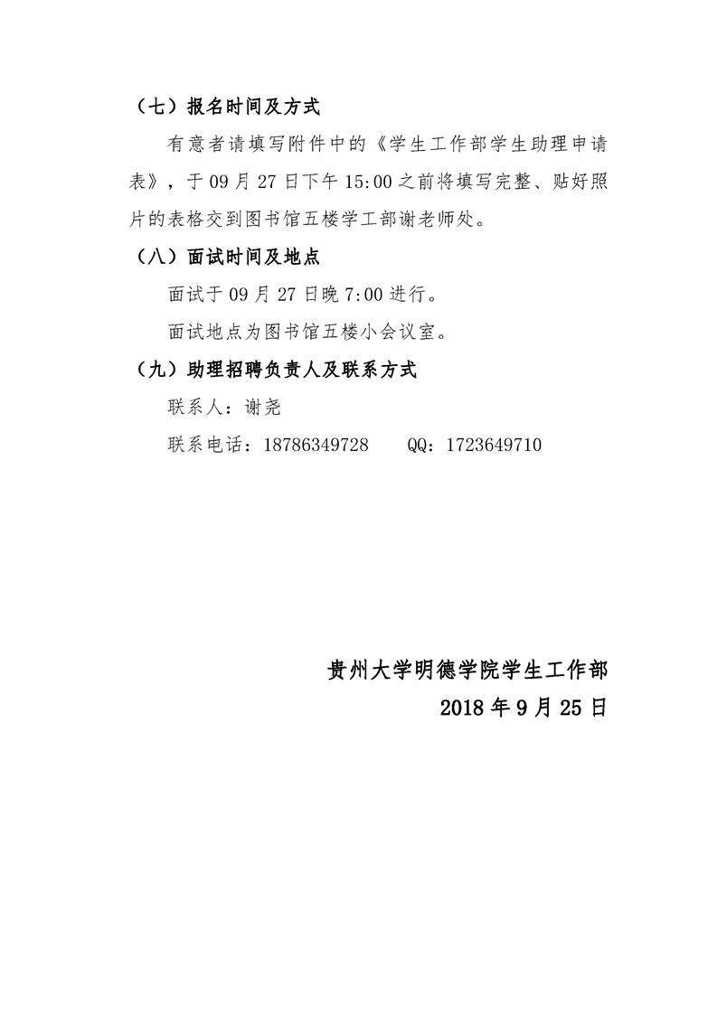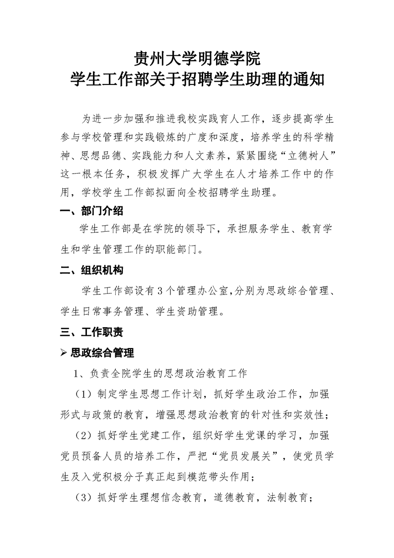 贵州大学明德学院 学生工作部关于招聘学生助理的通知