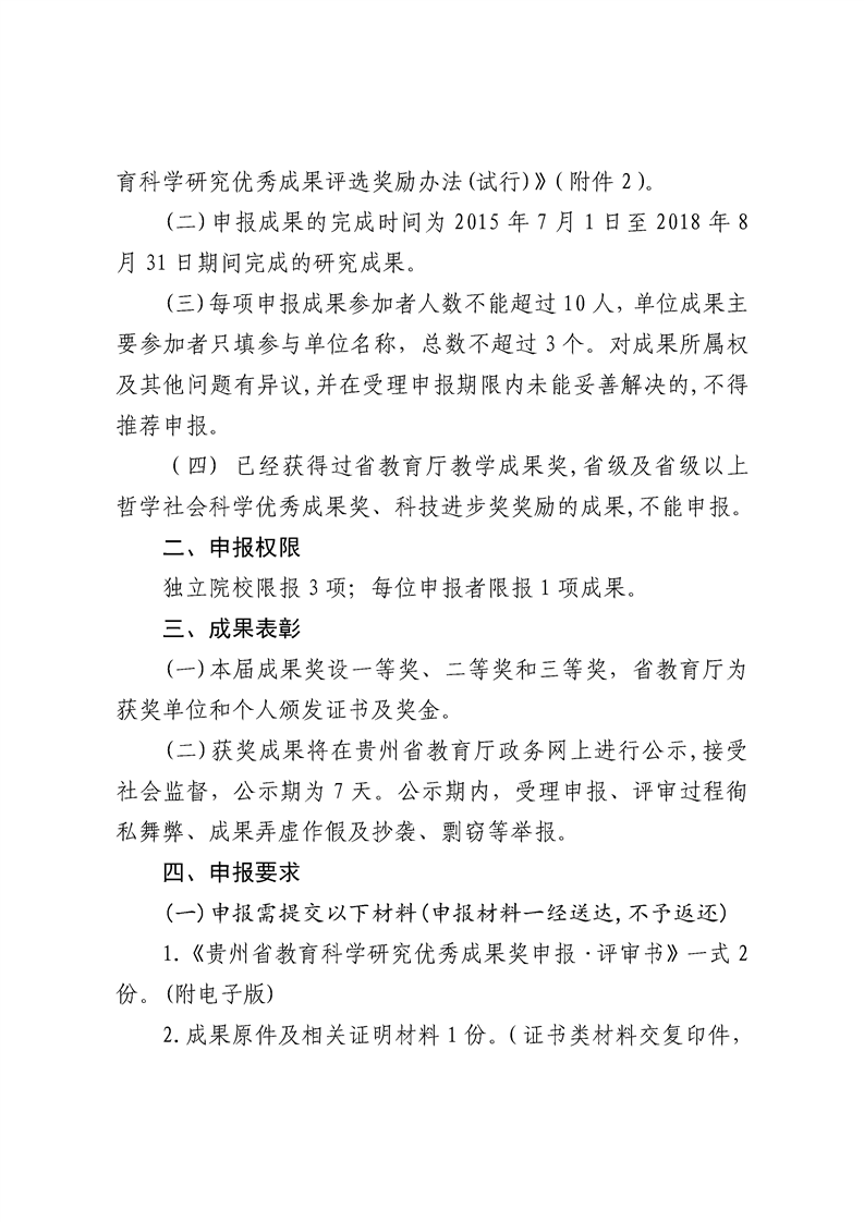 附件:附件1:省教育厅办公室关于组织开展贵州省第四届教育科学研究优秀成果奖申报评选工作的通知.pdf 附件2:贵州省教育科学研究成果奖励办法.doc 附件3:贵州省教育科学研究优秀成果奖申报•评审书.doc 附件4:贵州省教育科学研究优秀成果奖申报登记汇总表.xls