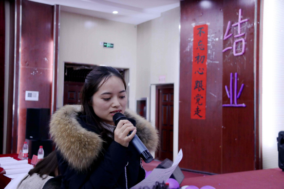 活动在全体师生合唱《光荣啊,中国共青团》下拉开序幕,首先罗一檾老师为本次活动致开幕词,他说到:大学生应做到“三走”——走出寝室、走下网络、走向操场,大学不仅仅是学习书本知识,更应该与社会接触,团干团校结业后希望同学们所学习到的知识能够有所实践,同时也希望在接下来的活动中看见同学们的出色演讲。随后,团校三班为同学们带来合唱《歌唱祖国》。接着,团干班为同学们展示了手工艺品并解说了“关于国的历史”、“怎样做合格的共青团员”、“怎样不负时光不负青春”、“通过团课我学到了什么”四个主题的内容。然后,团校一班PPT解说员向同学们展示了团干团校培训期间打扫教学楼、大学生使用手机问卷调查、食堂卫生和浪费问题等实践活动,并向同学们展示了手工艺品。解说结束,张兰波老师对第一组PPT展示进行了点评,夸赞同学们的手工艺品新颖且具有吸引力,提醒同学们:大学时光很快,同学们要给自己树立一个目标,最后祝同学们结业快乐。紧接着欣赏团校一班带来的吉他弹唱《柠檬树》,主持人公布小组成绩。接下来,团校二班进行PPT讲解和手工艺品展示,解说员通过PPT向同学们展示了一个星期团干团校培训课的课程,团校三班PPT解说员讲述了中国共产党的发展史与共青团的发展史并展示了手工艺品。健康管理系张丽老师对第二组PPT展示进行点评,夸赞团校三班的手工艺品和主题切合得很好,通过团校二班解说员展示的一个星期团干团校培训课,希望同学们都能学到每个老师所传授的知识,学到的东西也能付出实践,对两组解说员语言表达清晰、流畅提出表扬。随后,欣赏诗歌朗诵《青春需要梦想》,然后主持人公布第二组成绩,最终评审结果:团校一班以最高分获得优秀班级奖,团校一班王虹力获得优秀解说员,以及公布优秀学员、优秀工作人员名单,由张丽老师和张兰波老师为获奖的班级及同学颁奖并合影留念,各班代表上台领取结业证,罗一檾老师为学员代表发放结业证并合影留念。
