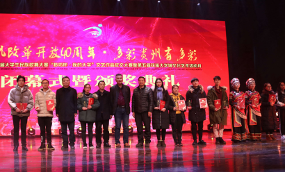 活动到达尾声,主持人宣布获得组织奖的高校,我院荣获组织奖。贵州日报报业集团党委书记、社长邓国超,贵州民族大学党委副书记、校长陶文亮,贵州师范大学党委副书记银熙惠,贵州财经大学党委委员副校长杨勇,贵州日报报业集团董事长助理陈鹏宇、代乐,贵安新区花溪大学城党工委委员纪工委书记刘云东为包括我院在内的学校颁发组织奖。获得组织奖的同时,我院罗一檾老师荣获优秀指导老师奖,同时我院嘻哈社的原创歌曲《大明屯堡》入围前八强,荣获优秀奖。活动最后,领导及嘉宾、演员上台合影留恋。