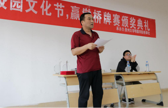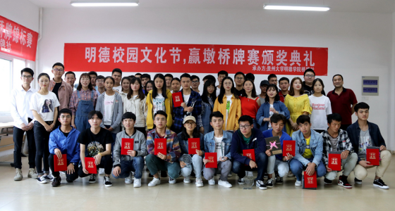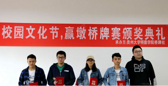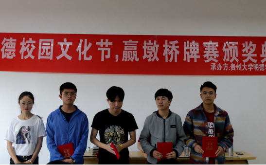 新闻网讯(团委/罗一檾 团宣/周飞 摄影/曾小琴)5月26日,我院在花溪大学城校区B栋103教室举办了桥牌赢墩锦标赛,院团委李宣志老师参加了本次活动,黄志航老师担任本次比赛裁判长。本次活动由共青团贵州大学明德学院委员会主办,贵州大学明德学院学生社团联合会桥牌社承办。