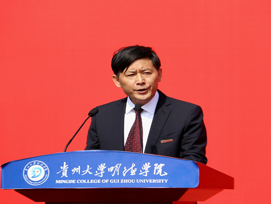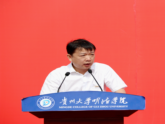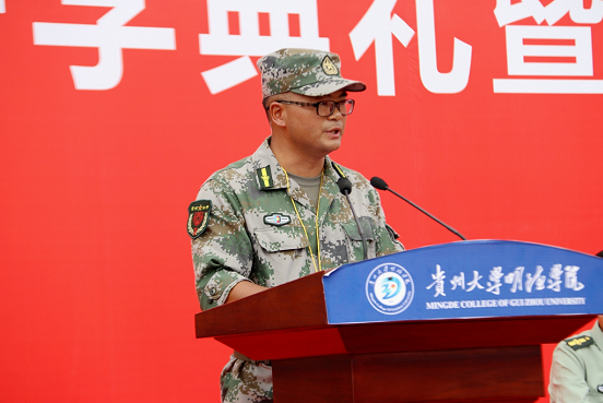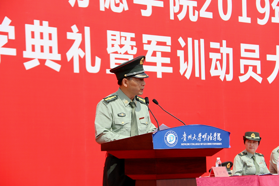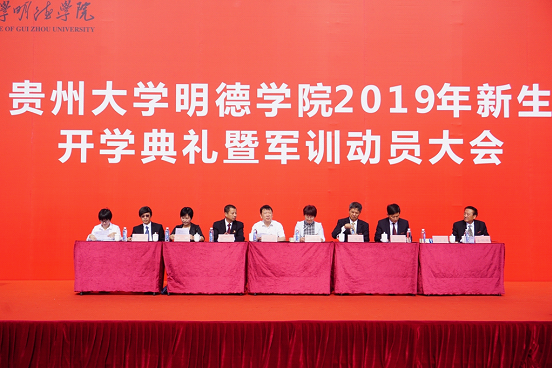 新闻网讯(团委/罗一檾 团宣/陈力 摄影/蒋涛)9月3日我院在一号足球场举行“2019年新生开学典礼暨军训动员大会”活动。莅临本次活动的嘉宾有:贵州大学党委副书记令狐彩桃、贵州大学明德学院副董事长谢田凯、学院执行董事邱军、学院院长王颖华、学院党委书记郭林桦、学院常务副院长罗卫东、学院副院长谢静、学院党委副书记金明辉、学院副院长杨波、学院校友代表刘晓芳、贵州大学明德学院各相关部门负责人、军训团各连连长、指导员,及2019级全体师生。活动分为两个阶段,第一阶段由常务副院长罗卫东主持,第二阶段由2019级新生军训团副政委金明辉主持。