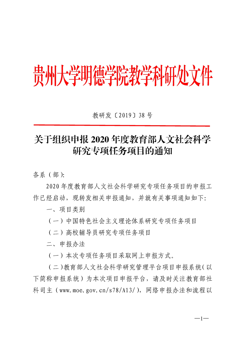 关于组织申报2020年度教育部人文社会科学研究专项任务项目的通知