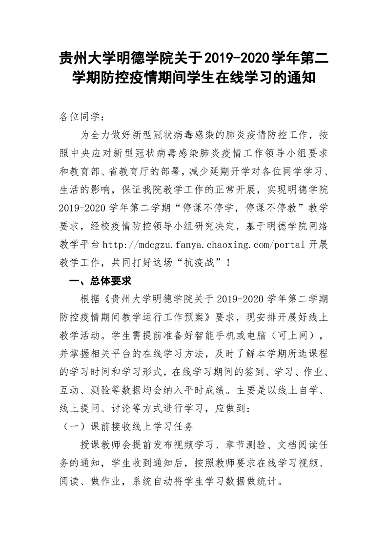 贵州大学明德学院关于2019-2020学年第二学期防控疫情期间学生线上学习安排的通知