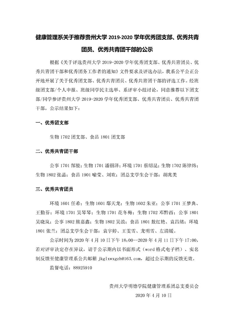 健康管理系关于推荐贵州大学2019-2020学年优秀团支部、优秀共青团员、优秀共青团干部的公示