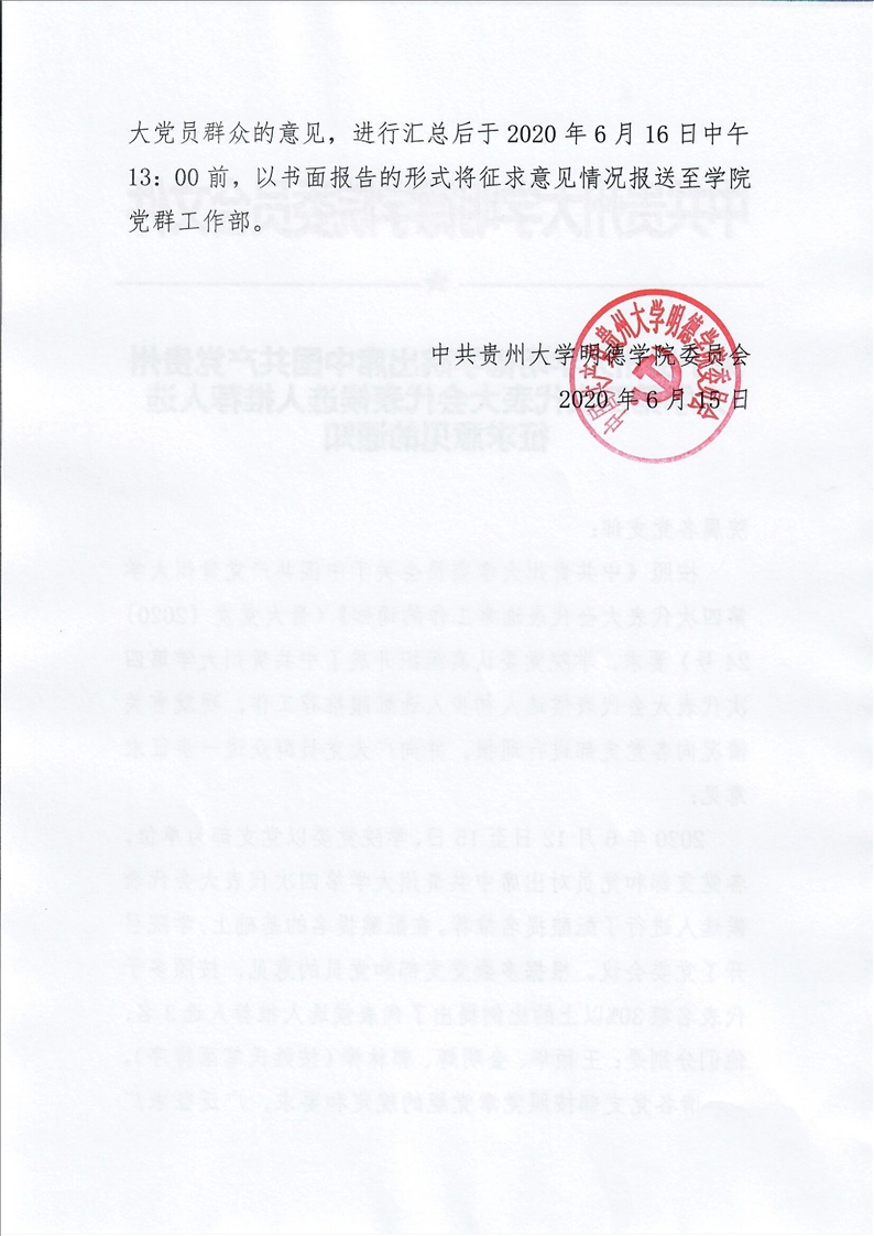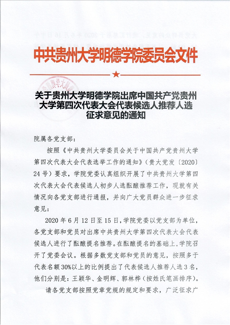 关于贵州大学明德学院出席中国共产党贵州大学第四次代表大会代表候选人推荐人选征求意见的通知