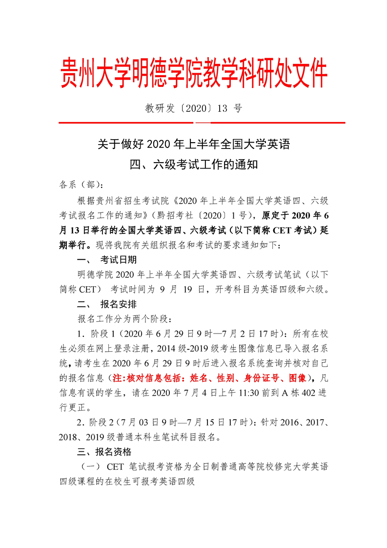 关于做好2020年上半年全国大学英语四、六级考试工作的通知