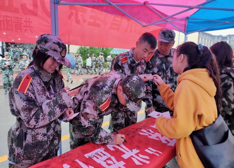 (图为志愿者向同学们介绍活动内容及同学们在横幅上签名)