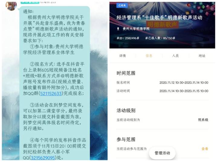 为此,我系于2020年11月12日至11月15日开展“十佳歌手”活动。参加对象为贵州大学明德学院经济管理系所有在校学生。我系在活动之初就进行了详密的计划,做出详细的策划书,并推出一系列宣传活动,并在(到梦空间)积极组织学生报名,为本次活动的圆满奠定了坚实的基础。