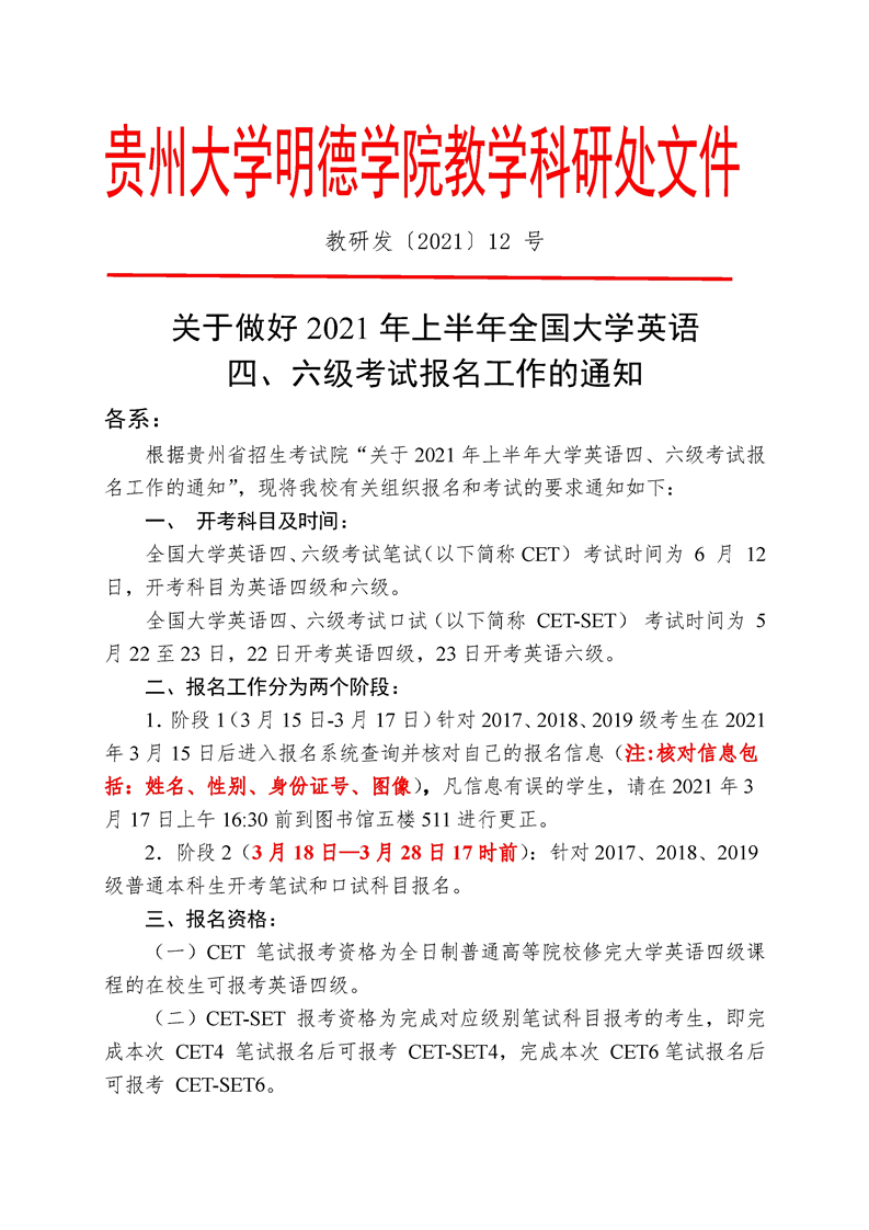 关于做好2021年上半年全国大学英语四六级等级考试报名的通知