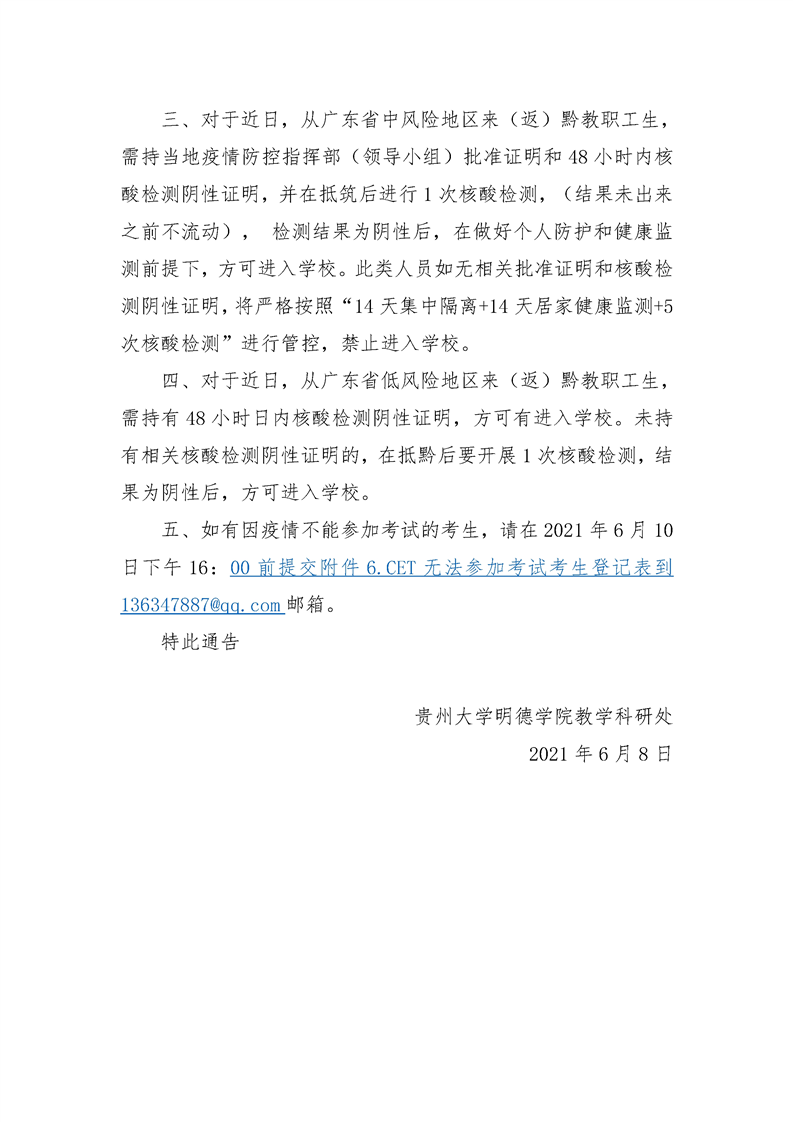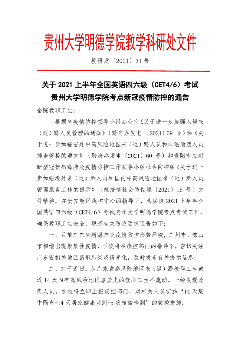 关于2021上半年全国英语四六级(CET4/6)考试 贵州大学明德学院考点新冠疫情防控的通告