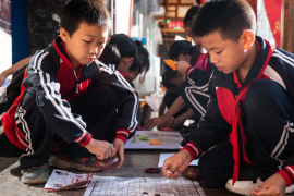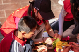 图为志愿者与小朋友一同折纸