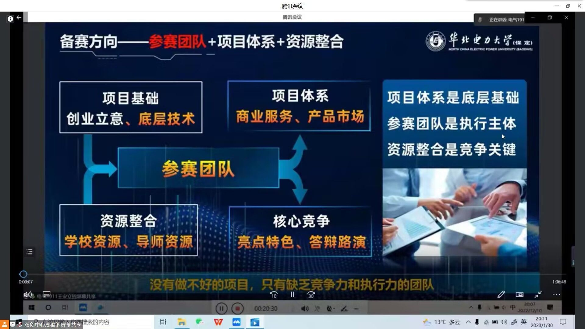 首期于2023年1月30日通过腾讯会议平台开展,本次假期线上培训的主要为中国国际“互联网+”大学生创新创业大赛做赛前准备,此次培训对如何组建参赛团队和准备比赛项目做一些详细介绍。紧接着,老师提出了一些比赛技巧,团队贴切的分配、合理的成员配置、成员的学科交叉成为团队能够成功脱颖而出的必备条件。