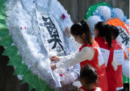 师生向戴安澜将军敬献花圈,在烈士英雄纪念碑前肃立默哀,接着各支部献花,向戴安澜将军行三鞠躬礼,党支部学生代表李想做演讲、全体师生有序进献白花,表达对戴安澜将军的敬意。