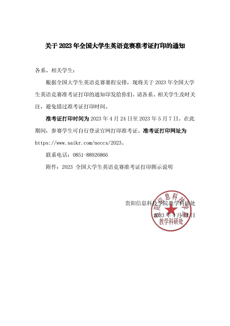 关于2023年全国大学生英语竞赛准考证打印的通知