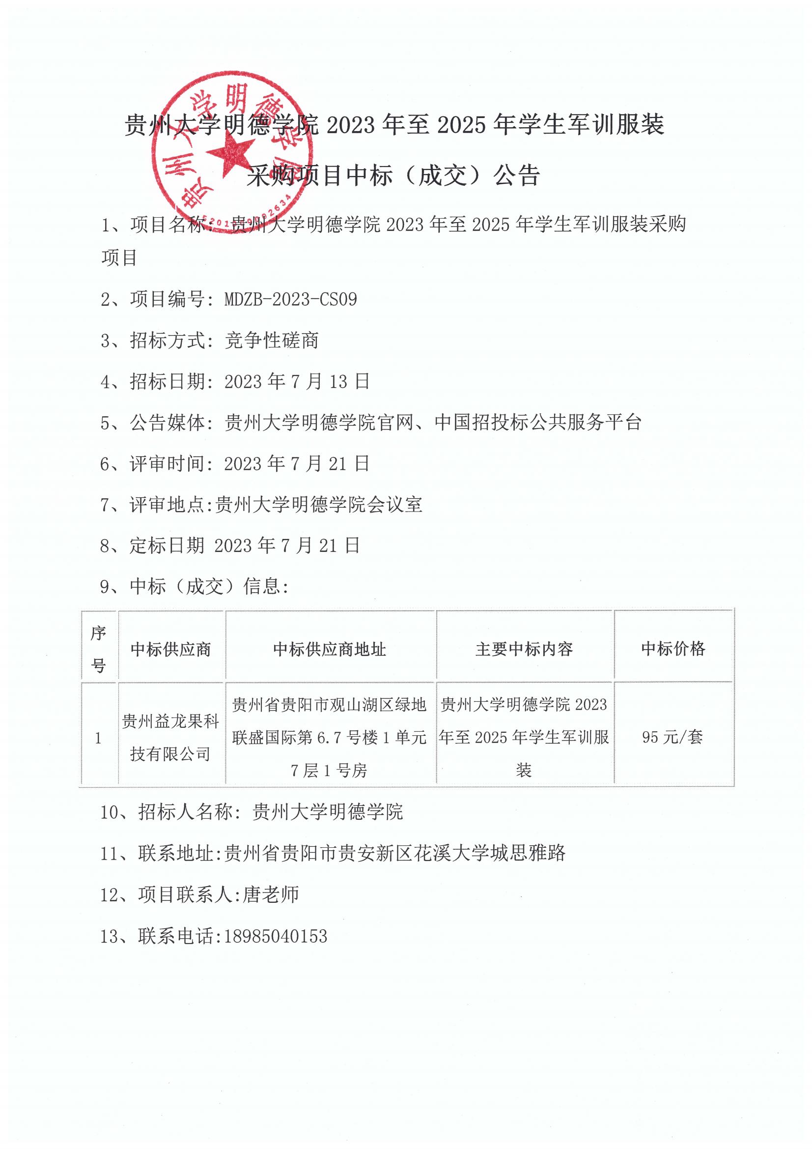 贵州大学明德学院2023年至2025年学生军训服装采购项目中标公告