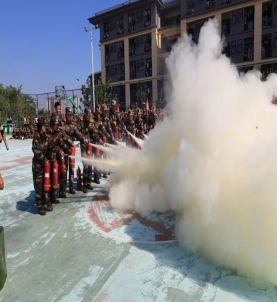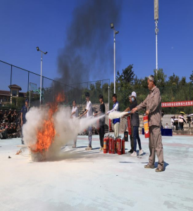 新区消防支队消防员为全体参演人员讲解ABC干粉灭火器的正确使用方法及操作技能,教师、学生、后勤、食堂、商户等工作人员代表现场体验灭火实操。