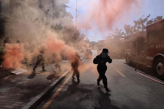 早上10:00,党委书记郭林桦宣布演练开始命令,一号学生公寓内模拟火情,浓烟升起,在消防员正确引导下,参演学生弯着腰,用湿毛巾捂住口鼻,紧张、快速、有序地疏散至安全区域,此次演练达到预期效果。
