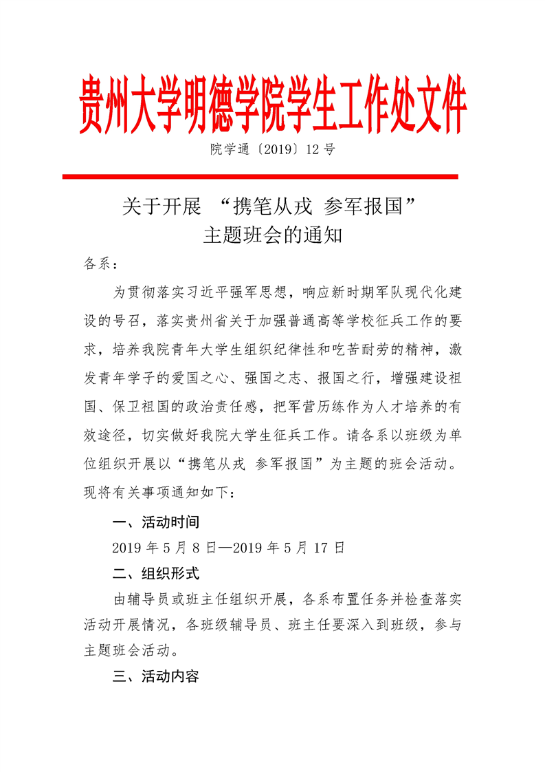 关于开展 “携笔从戎 参军报国”主题班会的通知