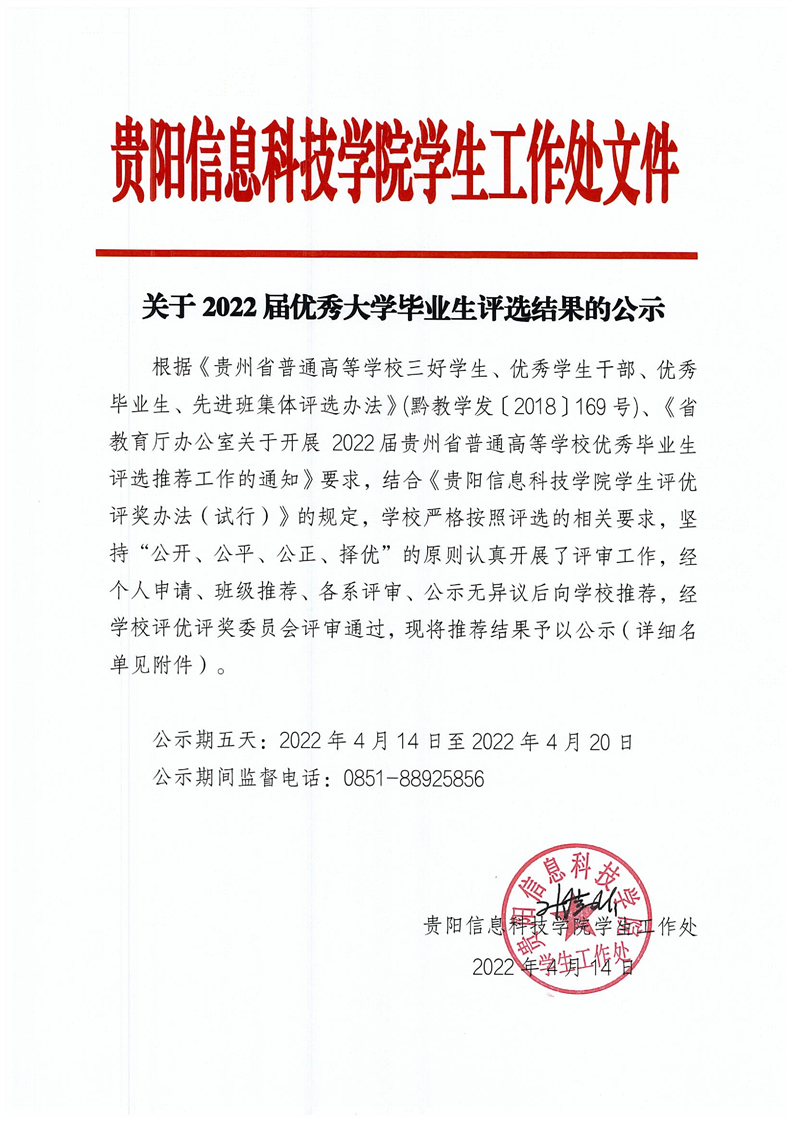 pp电子官方网站关于2022届贵州省普通高等学校优秀大学毕业生评选推荐结果的公示