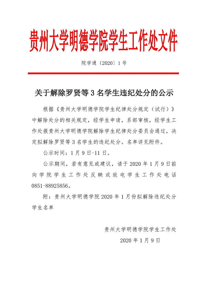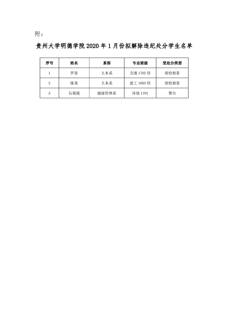 贵州大学明德学院关于解除陈婷等8名学生违纪处分的公示