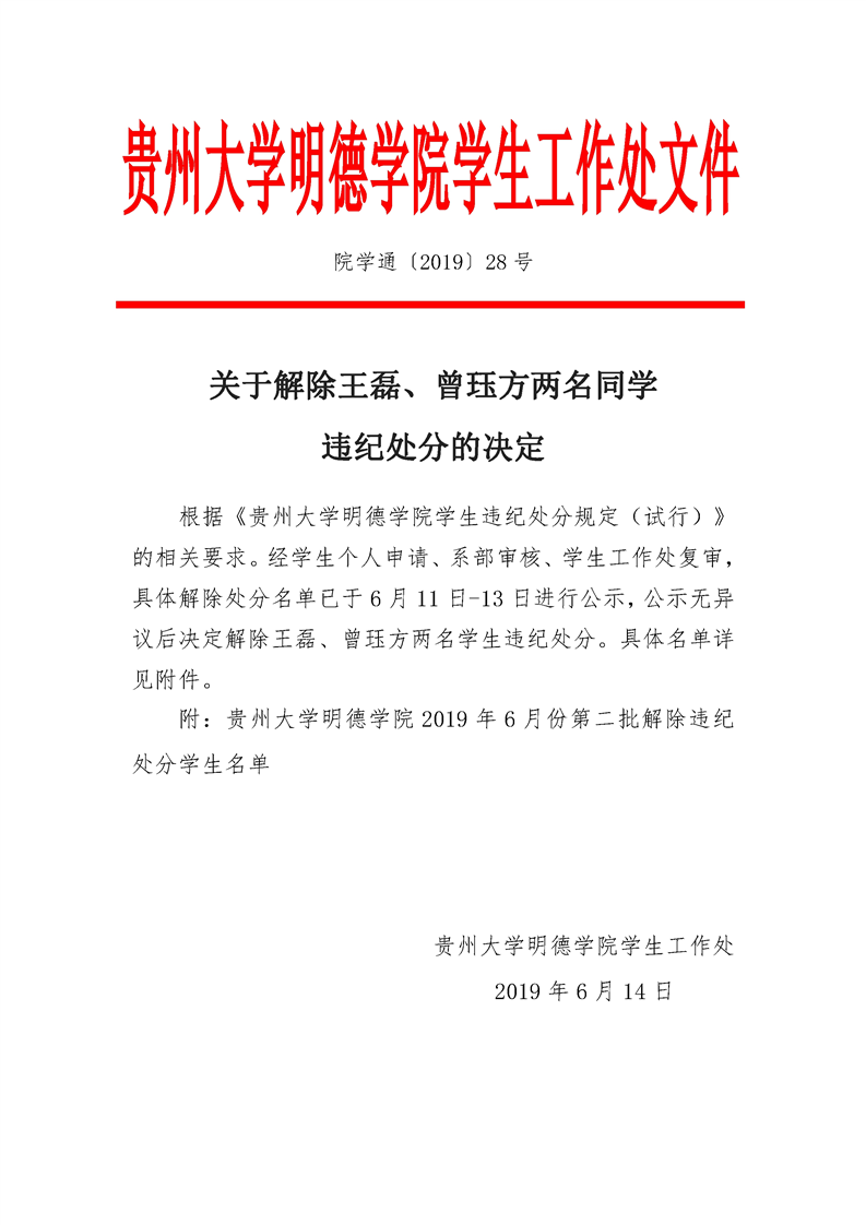 关于解除王磊、曾珏方两名同学违纪处分的决定