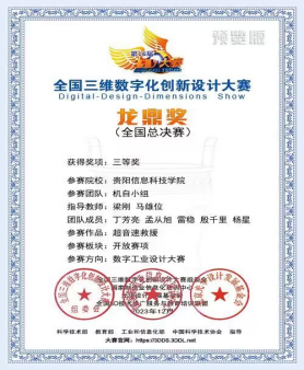全国三维数字化创新设计大赛(Digital-Design-Dimensions Show,简称:3D大赛,3DDS或3DShow)先后由国家科技部、工信部、教育部、中国科协等部门指导,由国家制造业信息化培训中心等单位主办,已成为全国规模最大、规格最高、水平最强、影响最广的全国大型公益品牌赛事与“数字化+创新创造”行业盛会,已被教育部列入全国高校学科评估体系,是全国普通高校大学生竞赛榜单内竞赛项目之一。在第十六届全国三维数字化创新设计大赛中,自2023上半年启动以来,通过大赛初评、复评及线下决赛,由pp电子智能工程系梁刚、马雄位老师指导的参赛团队在贵州赛区决赛中获特等奖1项、二等奖1项;全国总决赛中获国赛三等奖1项。