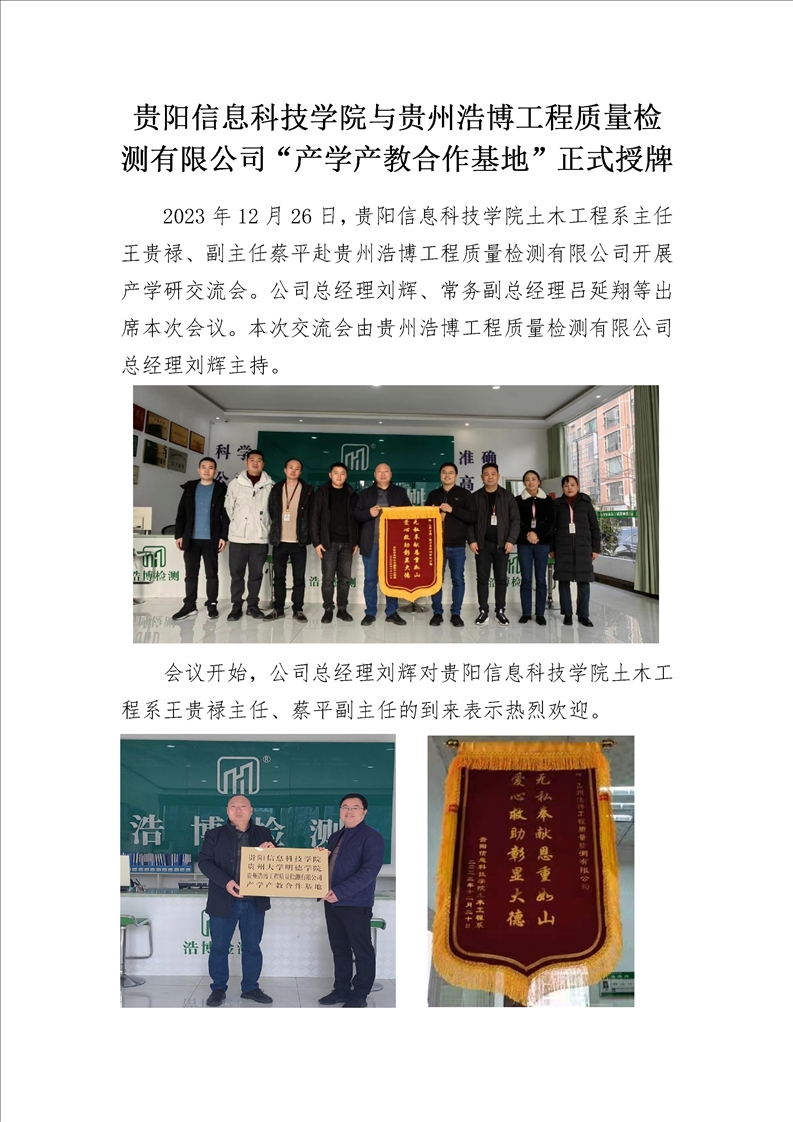 pp电子官方网站与贵州浩博工程质量检测有限公司“产学产教合作基地”正式授牌