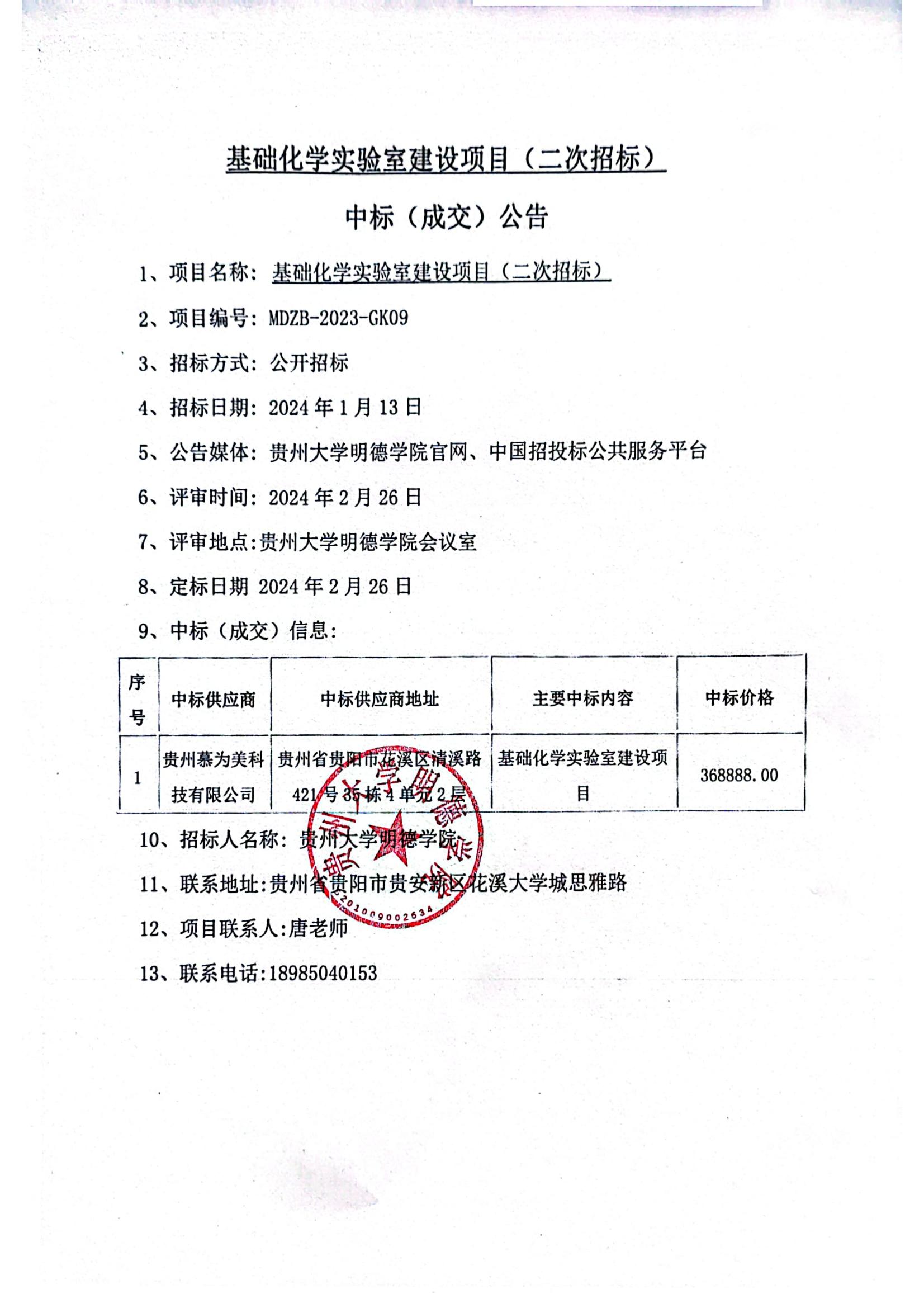 贵州大学明德学院基础化学实验室建设项目(二次招标)中标(成交)公告