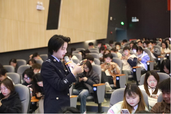 活动中,侦防中心民警袁孟蜻从电信网络诈骗的定义、校园师生受骗的常见诈骗类型、网络诈骗防范建议三个方面展开了宣教,讲解了辖区高校发生的真实案例,用相关案例揭示电信诈骗的手段和途径,还穿插了反诈现场教学。通过以案释法,利用“身边案例教育身边人、身边案例警示身边人”的方式,提醒同学们没有一种反诈技术是一招鲜吃遍天,要多方面进行防范,更重要的是不断学习防诈骗知识、了解诈骗的套路。还提醒同学们,不要成为非法买卖“两卡”的“工具人”。
