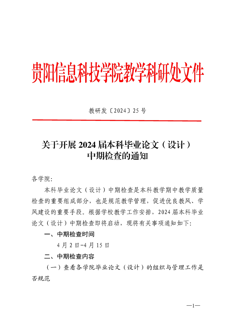 关于开展 2024 届本科毕业论文(设计)中期检查的通知