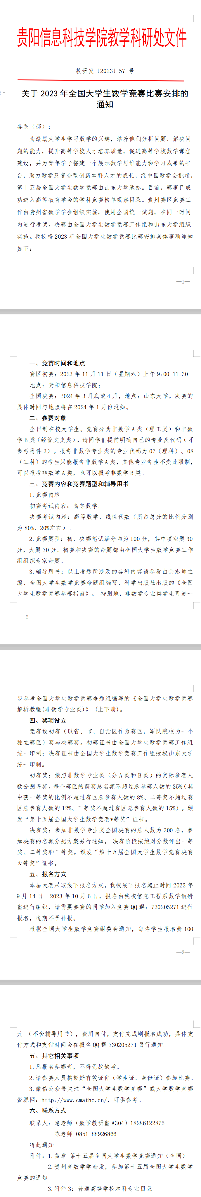 关于2023年全国大学生数学竞赛比赛安排的通知