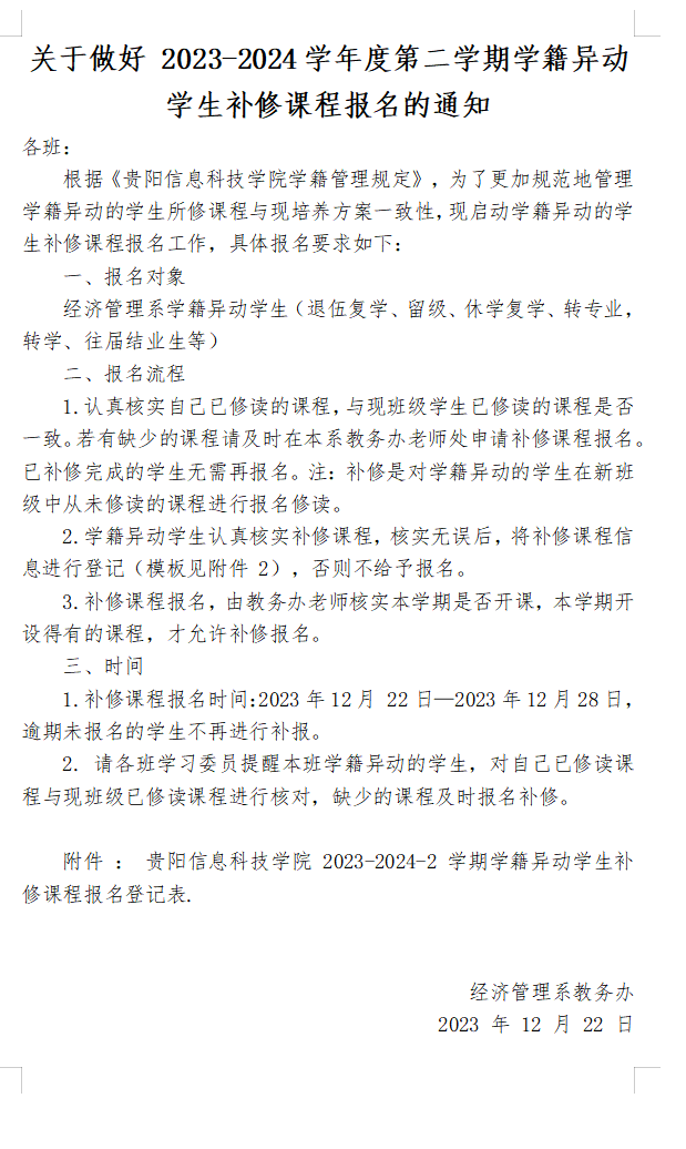 关于做好 2023-2024学年度第二学期学籍异动学生补修课程报名的通知