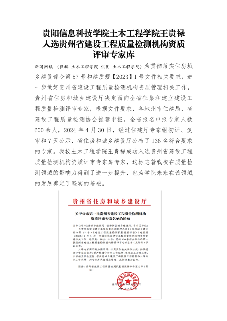 pp电子官方网站土木工程学院王贵禄 入选贵州省建设工程质量检测机构资质 评审专家库
