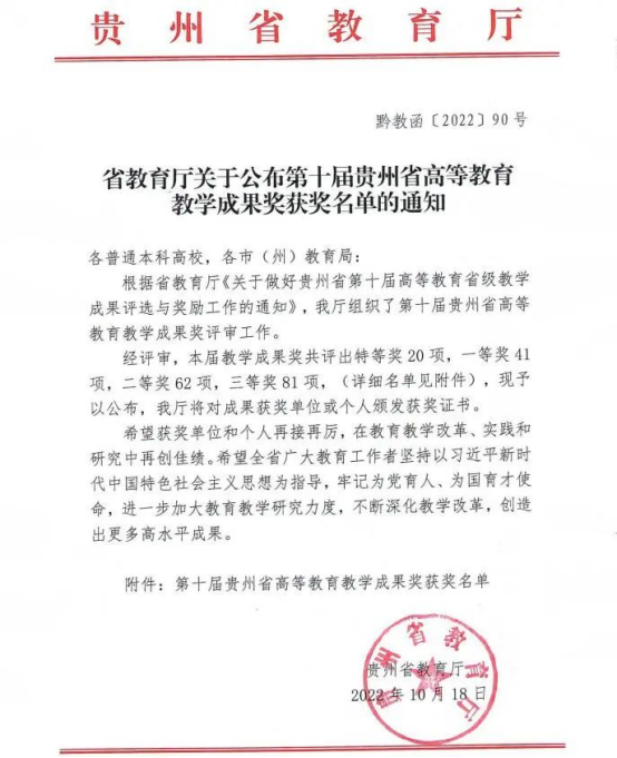 贵州省教学成果奖作为全省教育教学领域的最高奖项,每四年评选一次,旨在奖励在教学改革、研究、实践中取得优秀教学成果的集体和个人,推进全省高等教育高质量发展。