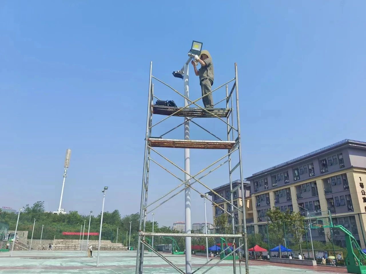 听说基建处利用五一期间更换了运动场和篮球场损坏的灯光,可以详细给我们介绍一下吗?