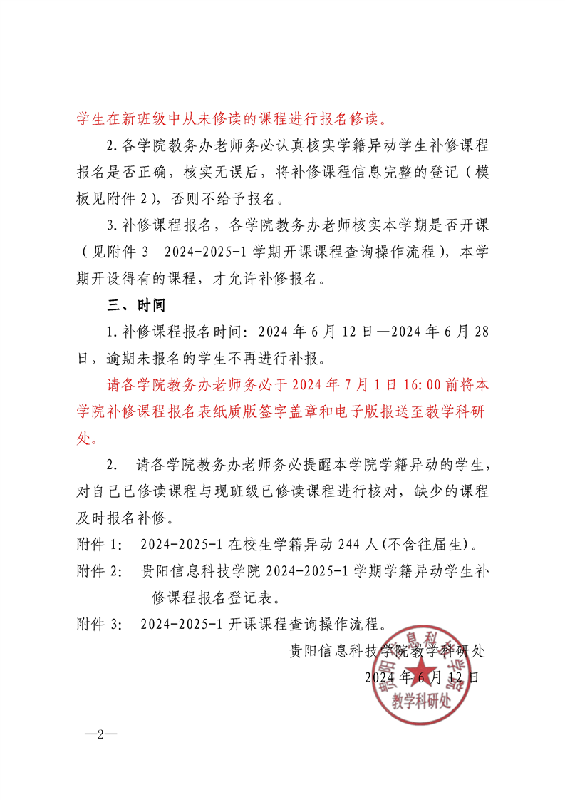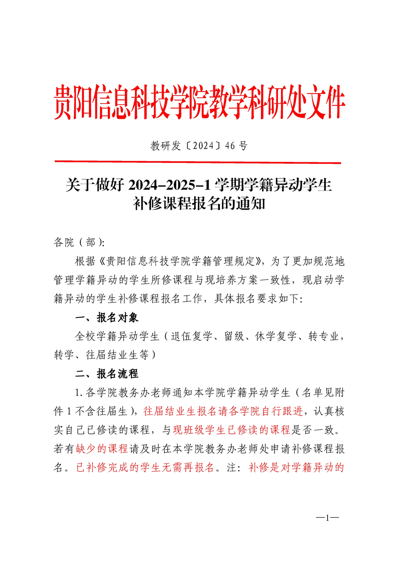 关于做好 2024-2025-1 学期学籍异动学生 补修课程报名的通知