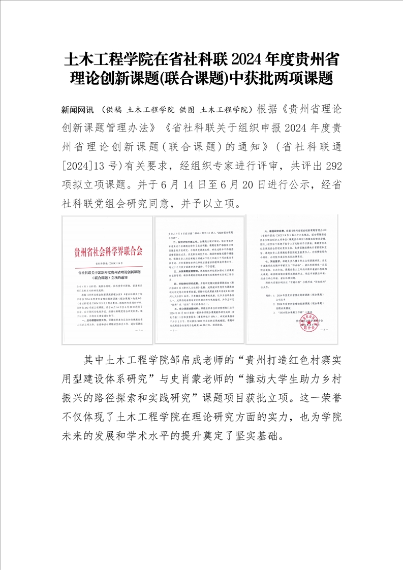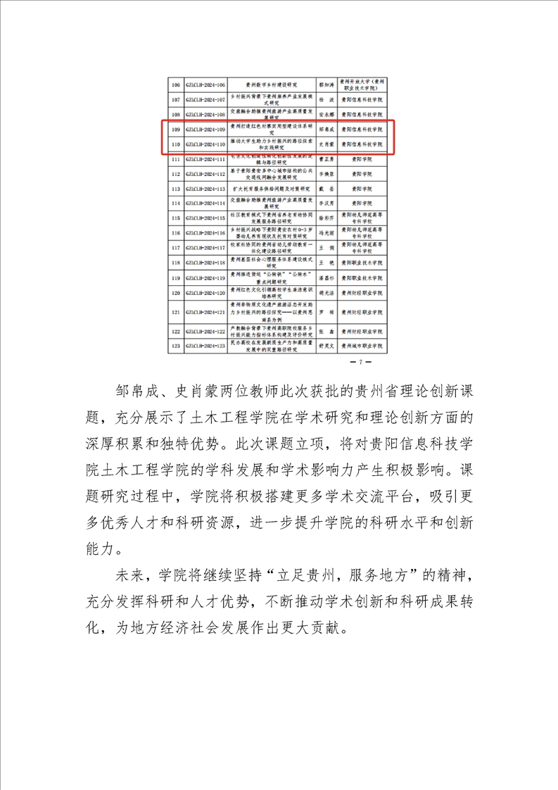 土木工程学院在省社科联2024年度贵州省理论创新课题(联合课题)中获批两项课题