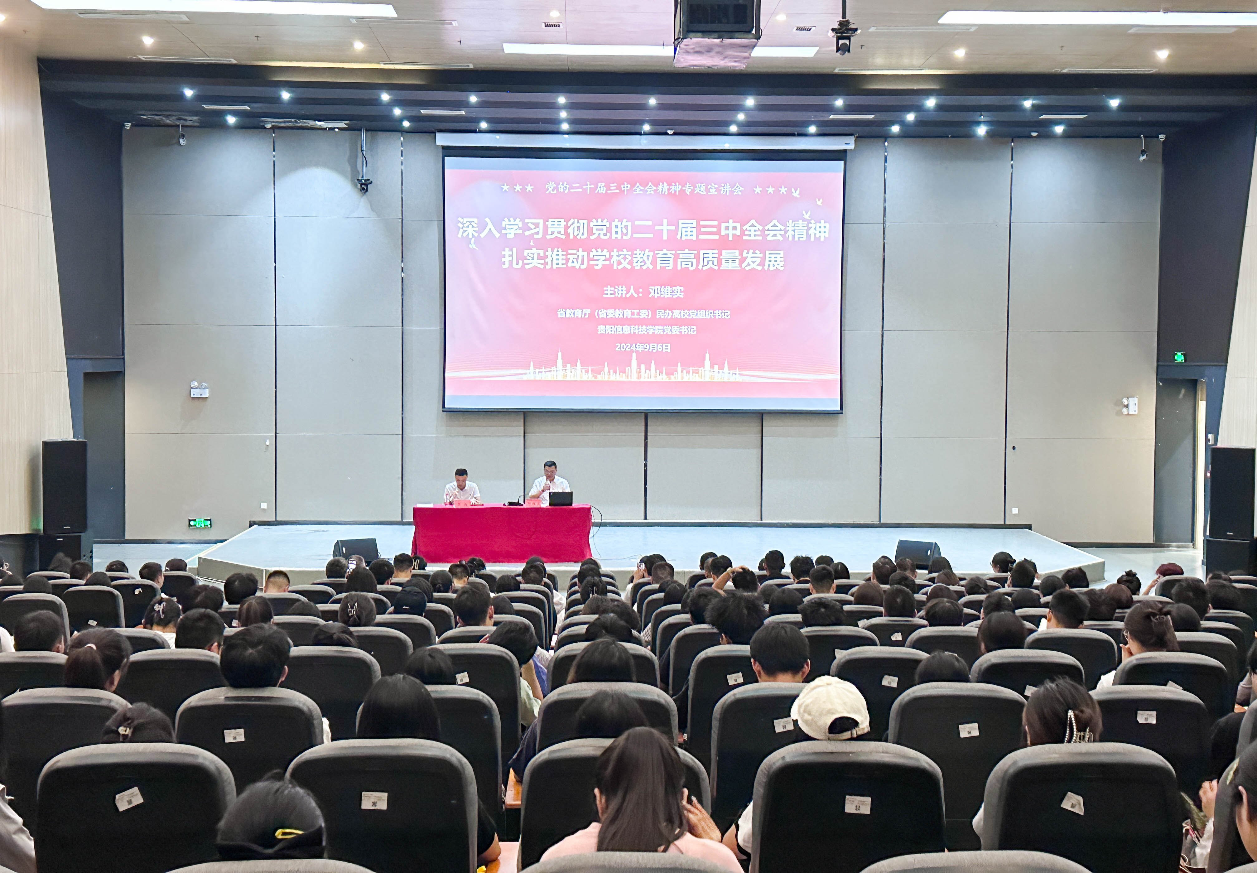 新闻网讯(供稿/供图 党群工作部)9月6日上午,学校在图书馆二楼学术报告厅举行宣传贯彻党的二十届三中全会精神专题宣讲。省教育厅(省委教育工委)民办高校党组织书记、学校党委书记邓维实作专题宣讲,校办公室主任吴扬主持。pp电子各党总支书记,全体行政人员、辅导员、思政课教师及学生代表共300余人参加。