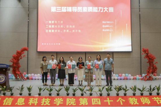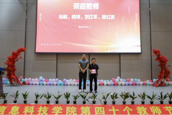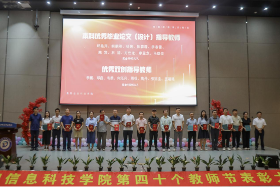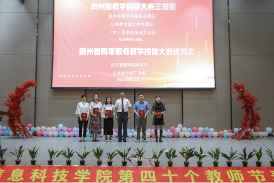 在表彰大会上,副校长罗卫东宣读了《pp电子官方网站关于2024年教师节表彰的决定》,宣读了pp电子2023-2024学年度表现优异的42名教师和3个团队的名单:数字传媒学院张桢尧团队、公共教学部江林焱团队、土木工程学院张涟英团队荣获“贵州省教师教学创新大赛”三等奖;经济管理学院邱艳萍、公共教学部万俊桃荣获“贵州省青年教师教学竞赛”优秀奖;石润等10名教师获“优秀毕业论文(设计)指导教师”荣誉称号;邓磊等8名教师获“优秀双创指导教师”荣誉称号;刘琦等13名教师获“优秀教师(十佳教师、校级名师)”荣誉称号;赵欢等4名教师获“优秀教师(十佳教师、校级名师)”提名奖;张兰波等6名辅导员获“第三届辅导员素质能力大赛”一二三等奖项;此外,还对冯毅,杨涛,刘江平,周红武4名“荣退教师”颁发了荣誉证书及奖金。