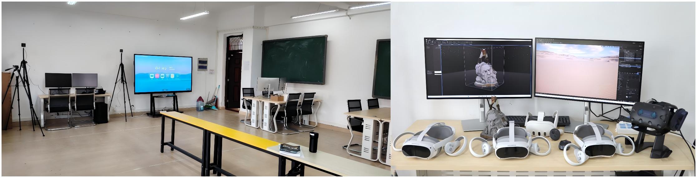 实验室位于C栋传媒楼2楼C204,总面积约为90平米,各类VR设备约10套,价值25万元。实验室现有3名相关专业的任课教师。其中,高级工程师1名、讲师1名,1名专职实验室管理员--夏腾飞。