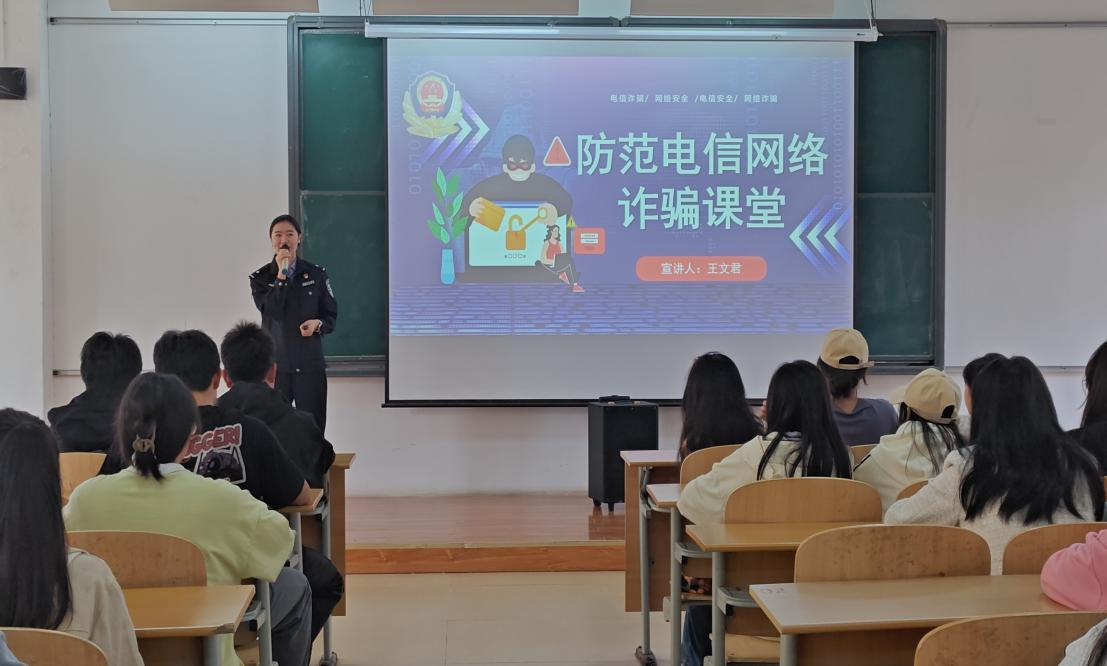 讲座中,贵安侦防中心民警王文君警官先是为同学们讲述了什么是电信诈骗,电信诈骗的特征和常用的诈骗方法等。随后重点对反诈知识,电信、网络贷款、兼职刷单、冒充熟人、网络购物等常见的诈骗手段和经典案例进行了深入细致的讲解。讲座现场气氛活跃,同学们也积极分享了自己亲身遇到的一些诈骗案例,并得到了侦防中心民警王老师的精心指导,同学们纷纷表示收获颇多。
