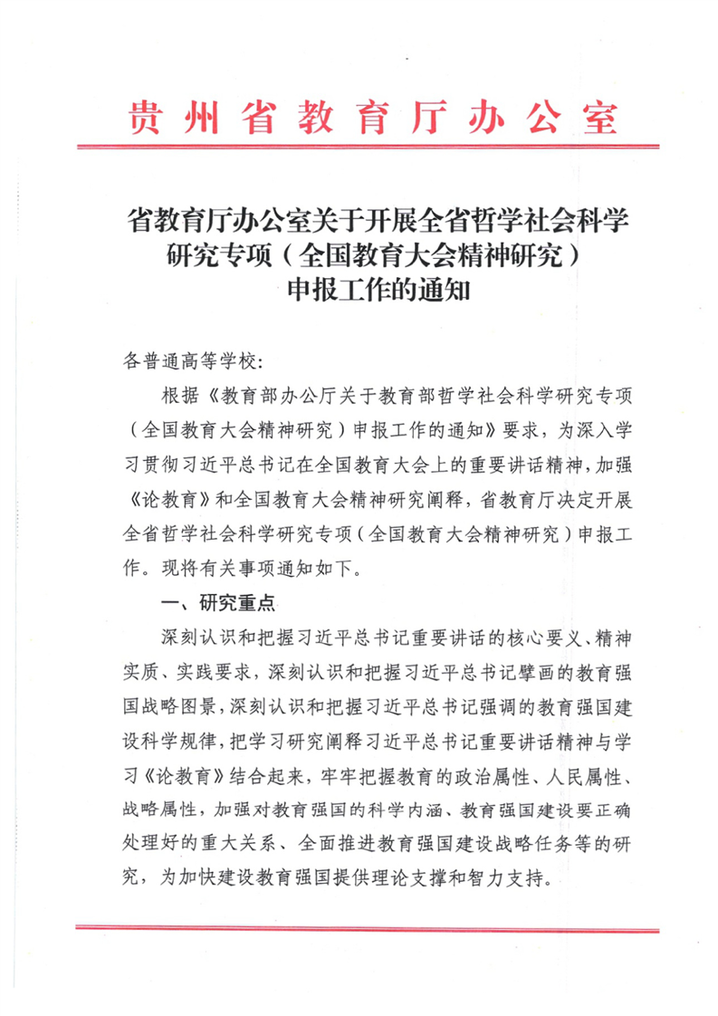 省教育厅办公室关于开展全省哲学社会科学研究专项(全国教育大会精神研究)申报工作的通知