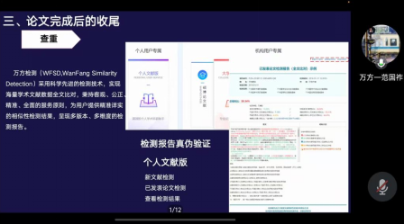 讲座中,范国祚老师指出了万方数据平台的学术检查功能可帮助同学们快速发现论文中不同问题,提高论文质量和学术水平。此外,范老师还介绍了该平台的个性化服务,让师生们能更便捷地获取自己所需的学术信息。