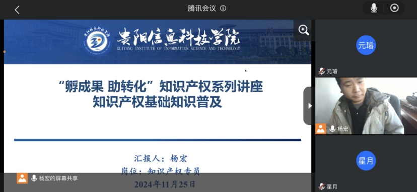杨宏根据国家知识产权局贵阳办事处近期主办的“国家知识产权局专利局贵阳代办处2024年度知识产权申请注册宣讲专题培训班”的授课知识内容,结合pp电子师生在日常工作及创新创业活动中遇到的知识产权相关的常见问题进行了统一讲解。