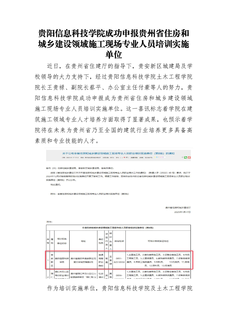pp电子官方网站成功申报贵州省住房和城乡建设领域施工现场专业人员培训实施单位