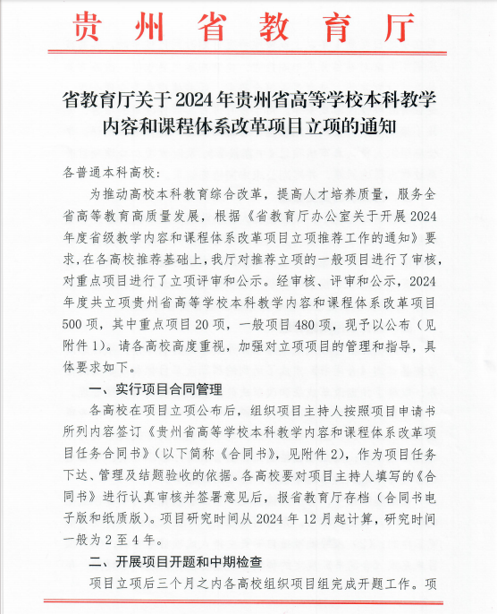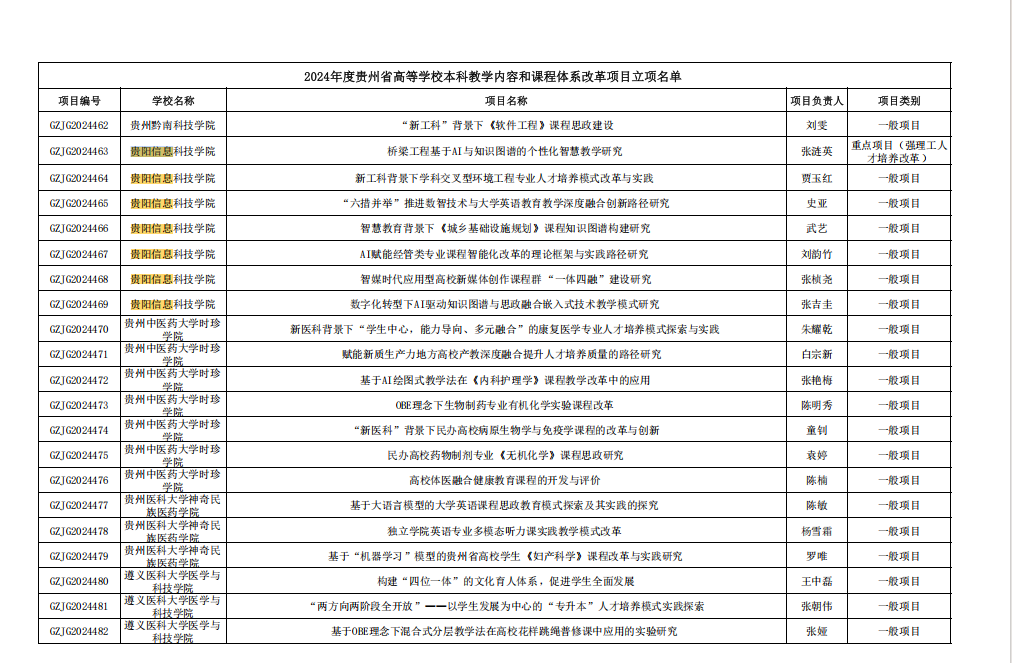 根据《省教育厅关于2024年贵州省高等学校教学内容和课程体系改革项目立项的通知》,pp电子张涟英等7名老师的教学内容和课程体系改革项目成功立项,包含1项重点项目(强理工人才培养改革项目)和6项一般项目。具体立项名单如下: