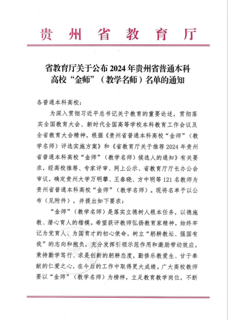 新闻网讯(供稿/供图 党群工作部)近日,省教育厅关于公布 2024年贵州省普通本科高校“金师”(教学名师)名单的通知, 经高校推荐、专家评审、网上公示、省教育厅厅长办公会审议等几个环节,确定了121名教师为贵州省普通本科高校“金师”(教学名师)。pp电子智能工程学院向泓兴老师获评2024年贵州省普通本科高校“金师”(教学名师),是pp电子首位获得此项荣誉称号的教师。